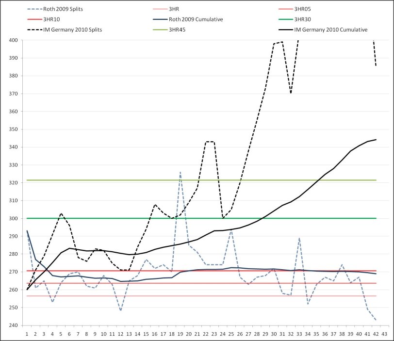 Here’s a comparison of the marathon from Challenge Roth last year and Ironman Germany last week. The dotted lines mark the km splits, the solid lines mark the cumulative time.