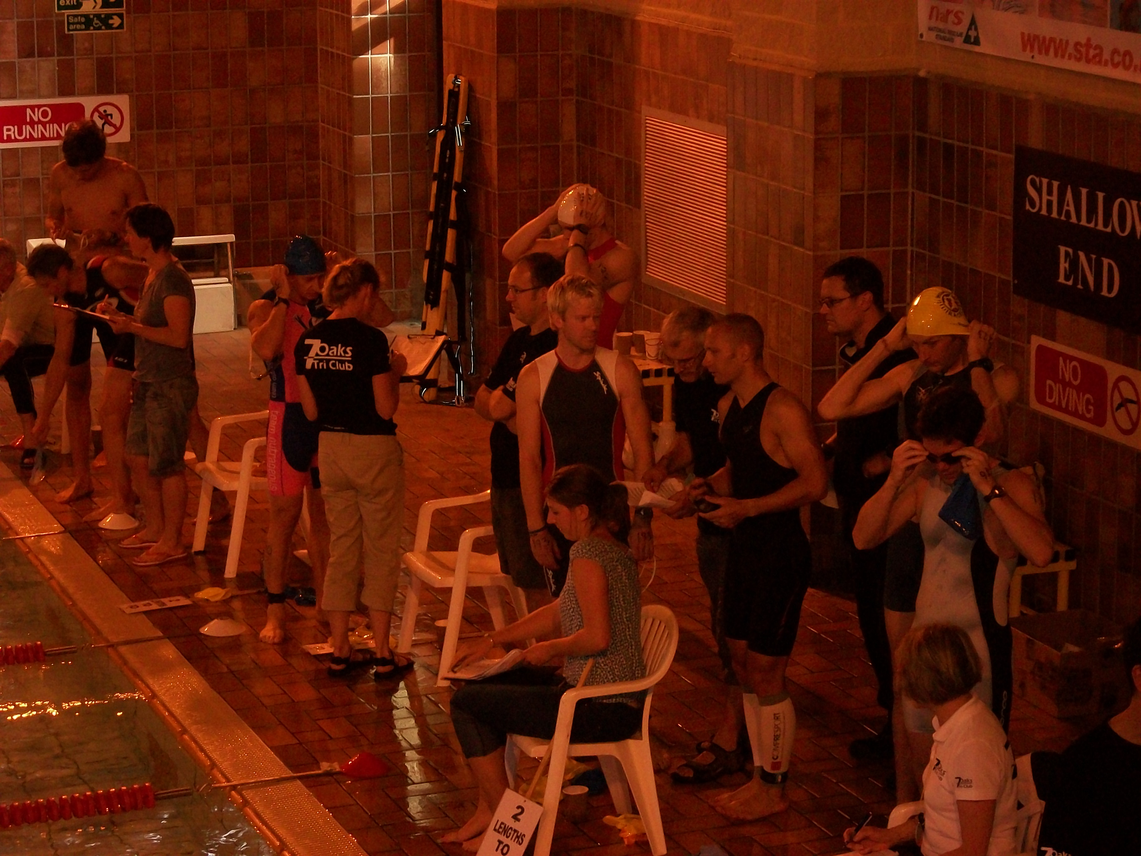 With a 9:45am start I had plenty of time to get ready and drive down with Yve. The race had already been underway since 6am, with the faster swimmers starting later in the day. Was great to meet Marianne and Justine, Mike and Team Outrageous, and some fellow competitors in the lead-up. No major problems before the race apart from having to hunt down a decent track pump (my current one is on its last legs) and only having a short warm-up. Arrangements were being made to set 10 of us off in one wave to make it a bit more exciting. I recognised one or two names from the past (eg Gary Bryant, Mark Whittaker) and was expecting them to finish on top by the end of the day. Ade Grimmond is also a member of Team Outrageous and an awesome swimmer. He’s usually doing <50mins Ironman swims so I expected him to be one of the first out of the pool. I shared a lane with a guy looking for 6mins. The lane to our right had Ade, and Neil Harris, who was looking for a 5min swim.