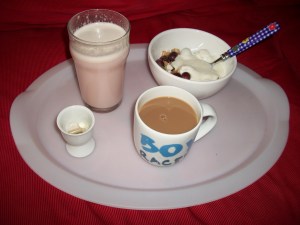 • Whey protein drink (20g flavoured, with water).  Occasionally I’ll have eggs (3 white/1 yoke) on