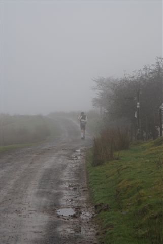 As the incline increased and we passed through a few more gates and stiles to the steep section of the climb the group exploded. I’d already noticed who I thought must have been the winner from last year (Mark Palmer) going off the front at this point. It was becoming quite tough as we entered the mist with the incline getting steeper and steeper to the point that most of us were using various forms of shuffle/walks. All except for one person of course! I didn’t want him to get away because a) I wasn’t as familiar with this first half of loop and visibility from mist was down to 30m, and b) I wanted to see how he handled the terrain and maybe put a little pressure on him later in the race. He was disappearing and I tried really hard to keep a light run going in zigzags up the climb mixed with a few strides while pushing my quads down with my hands to aid leverage. It was killing me, my quads were screaming.