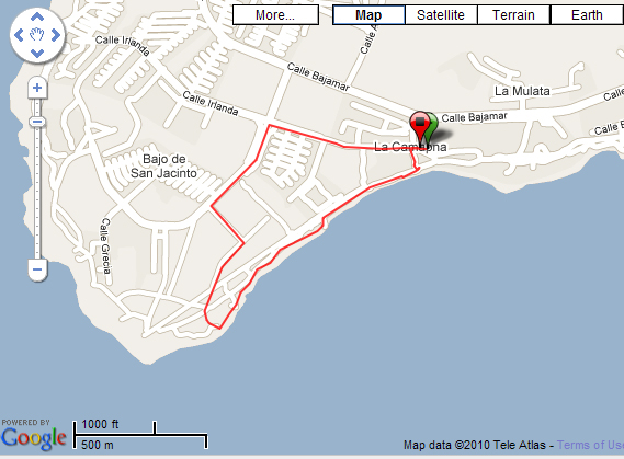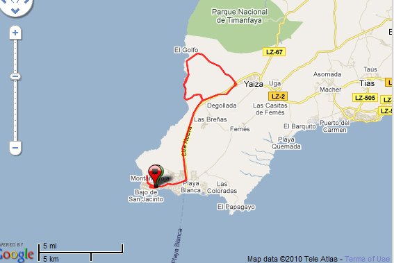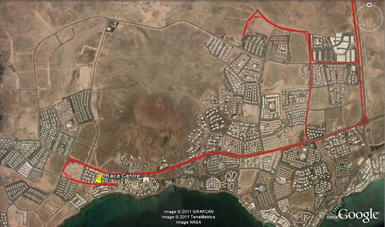 The 28mile lap/route leaves Playa Blanca heads NE towards Yaiza. There is a loop that starts along the coast to El Golfo and goes up over a mountain before returning south and back towards Playa Blanca. There is an extra dog-leg (funnily enough it starts where the dog bit me!) on the return that takes you through an Industrial Park. The two check-points (where you call out your race number) are at the beginning of the northern loop on a roundabout, and the Industrial park. It ensures no-one cuts corners (although I’ve heard from another competitor that this was not the case).