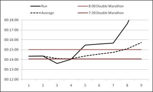 At the start of the run I had no idea how far I was behind Marcel Knaus (MK) and Paul Thompson (PT). I was hearing some strange times inc a 1hr lead. Having now looked at the splits after the race I can see that it was – 38mins and 27mins respectively. I was very confident about my running. I had been on great form over the autumn and winter. Mentally I was prepared to allow the leader(s) a 45-60min head start as I was confident I could pace to a 7:30-7:45 double marathon.