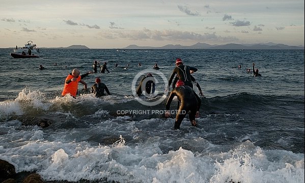 We flew out well in advance of the race, on Thu 27 Jan. Plenty of time to chill-out and do a few bike rides on the course. On Sat 29 Jan we went for the first recce. As we were cycling down towards Playa Blanca I noticed three dogs come running out into the main road. One went in front of the bike which forced me to brake, while another came up alongside me and took a bite into my lower calf/ankle. Blood started pouring out. No-one in the bar nearby seemed to speak English until a guy came up and introduced himself as Raf. Turns out he was one of the Enduroman helpers and was good enough to drive me to the local Clinic to get sorted. Luckily I didn’t rerquire an injection. The doctor was going to prescribe antibiotics, until I mentioned the race. As long as I applied a cream regularly and kept it bandaged I would be fine. No swimming for a few days.