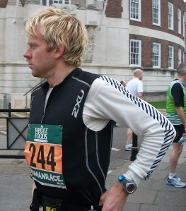 I wore my Asics Hyperspeed4 racing trainers at Kingston and a new pair of Nike elite compression socks.  I originally intended to race the London Marathon in these (200g) hyperspeeds but I’m now having second thoughts after getting a fair amount of stiffness from pounding damage on harder surfaces.  During the winter I was running most sessions in my old hyperspeeds and feeling comfortable albeit with an adapted ‘ultra’ running technique (shorter/faster strides with a low drag and flat footed strike).  This technique naturally switched as I moved back to more faster road running and I’m now having to consider other (shoe) options.  I have a heavier (300g) asics training shoe and a pair of Newton Gravitys at my disposal.  The Newtons may not be a bad idea as I have already done an Ironman marathon (IMUK10) in them and they will work alongside my natural mid to forefoot strike.  I can add a heel support for later in the race when I adopt the run technique to counter stiffness and fatigue.  However, they will weigh 325g (300g shoes, 25g inserts).  An extra 125g per foot is a little more than I would like over distance.  Pfitzinger & Douglas’ guidelines for racing a marathon in flats/racing shoes are a) weigh under 73kg, b) <=2:40(male) racing time, c) history of being injury free, and d) good biomechanics.  Unfortunately I can only satisfy a) and potentially d).