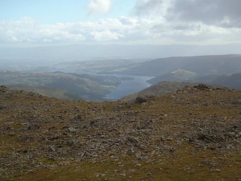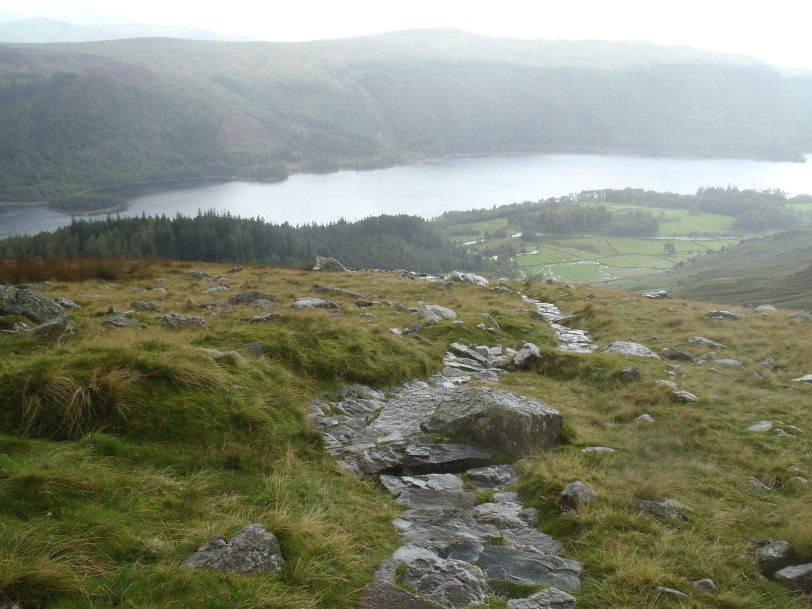 Pleasant (if expensive) bus trip up to Honister. I’d had to rush the morning preparations and run into town so I was keen to take a break at the Honister Cafe. Thought I’d try my new Salomon Acti-Lite shorts today, great kit. The first summit today was Dale Head (753m). I was a little stiff and sore from the off but surprised at how fresh I felt considering what I’d done the previous day. Of course I had to break into a hike for most of the climb but didn’t feel too bad. It became misty at the top and the wind started picking up again. It was just about bearable and I managed to make my way along Hindscarth Edge. I kept to the right (east) side of the ridge to reduce the impact of the (westerly) wind. Hindscarth (727m) was a breeze…a very strong breeze…from behind! So quite enjoyable. I tried to film myself running back down from Hindscarth towards Littledale Edge. There was a nice plateau at Robinson (737m) and despite the thick mist I was really enjoying myself. I knew the rest of the section would be downhill back to Keswick with some awesome views.