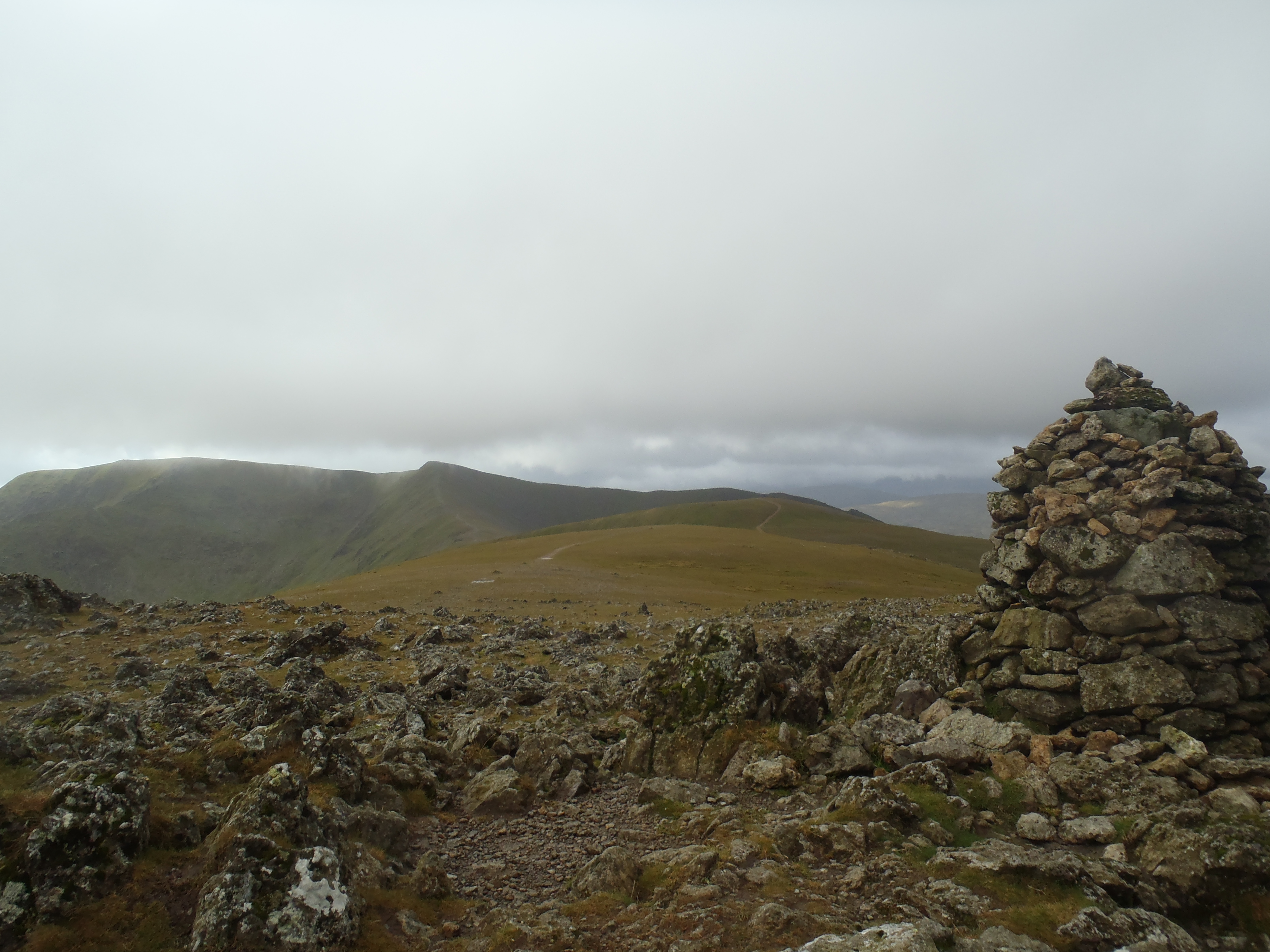 Clough Head (726m) was tougher than I was expecting. When I first heard about the BGR I didn’t expect the climbs to be so demanding and take so much time. The wind and rain had died though thanks in part to the prevailing being SW. But once I’d reached the top of Clough Head I could feel the full force and was keen to keep moving. For the next three hours I really enjoyed myself running along the Dodds (Great Dodd, Watson’s Dodd, Stybarrow Dodd) and Raise, taking pictures (not great as I had to keep clear of ridges, and misty) and occasionally glancing at the map, snacking and drinking. However, on the run down White Side (863m) the wind had really picked up to the extent that I was struggling to move.