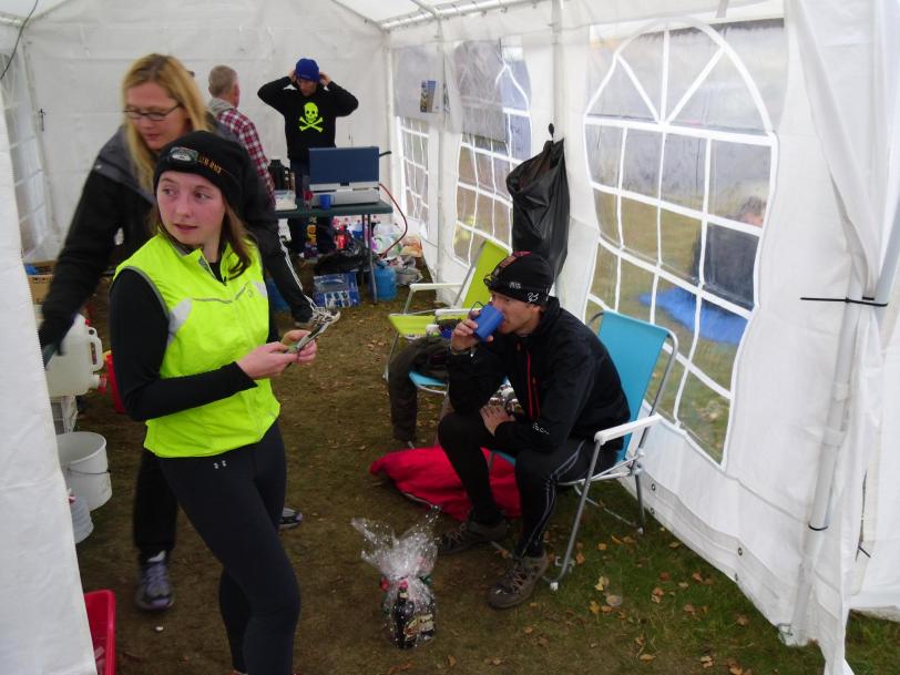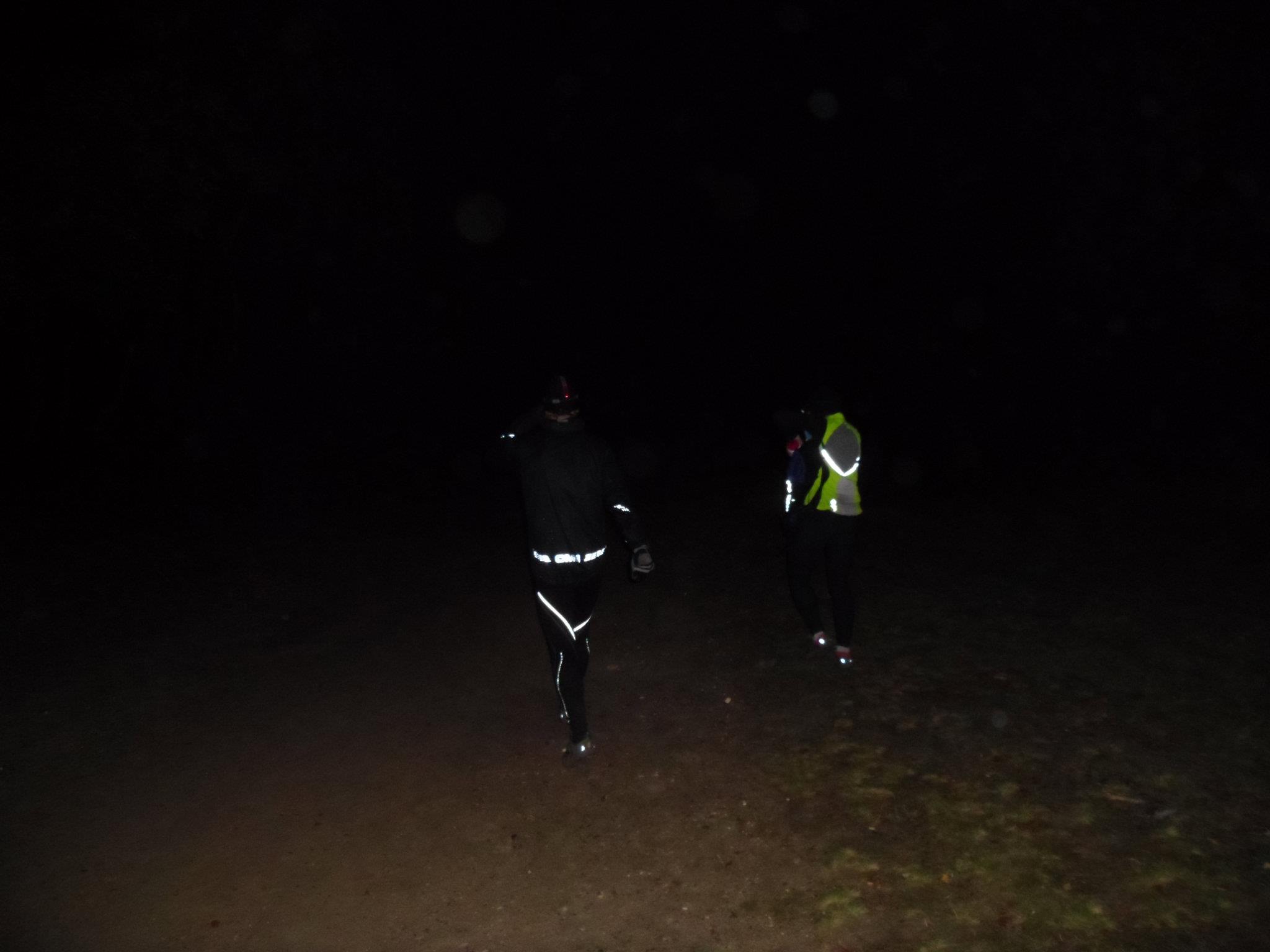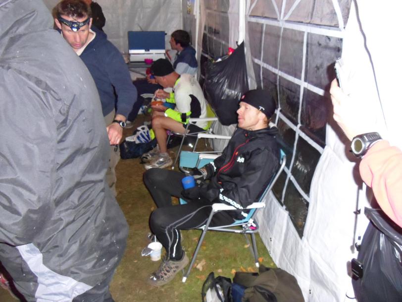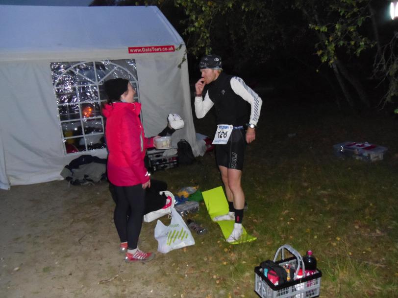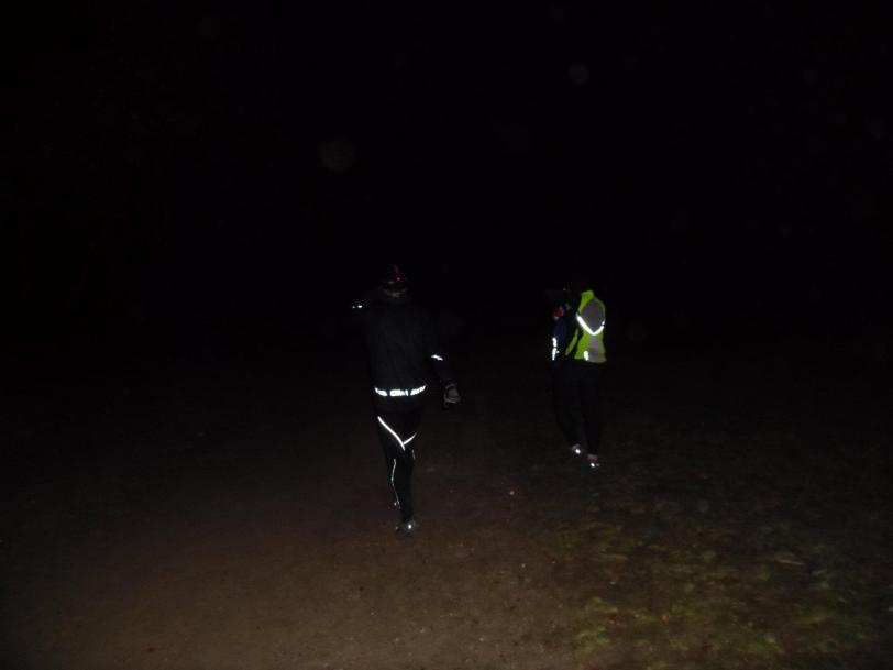 At the end of the lap I tried to nibble a bit more food but it was already becoming a struggle to get anything substantial into the stomach.  A few mouthfuls of pot noodle here, a piece of flapjack there.  There was plenty to choose from but my appetite was diminishing along with my legs.  Jo reminded me that after two more laps I’d have company which was good to know.  It was starting to get dark now so we put on a gillet, changed hats, compression socks (I was getting blisters from the other socks) and attached the headlamp.