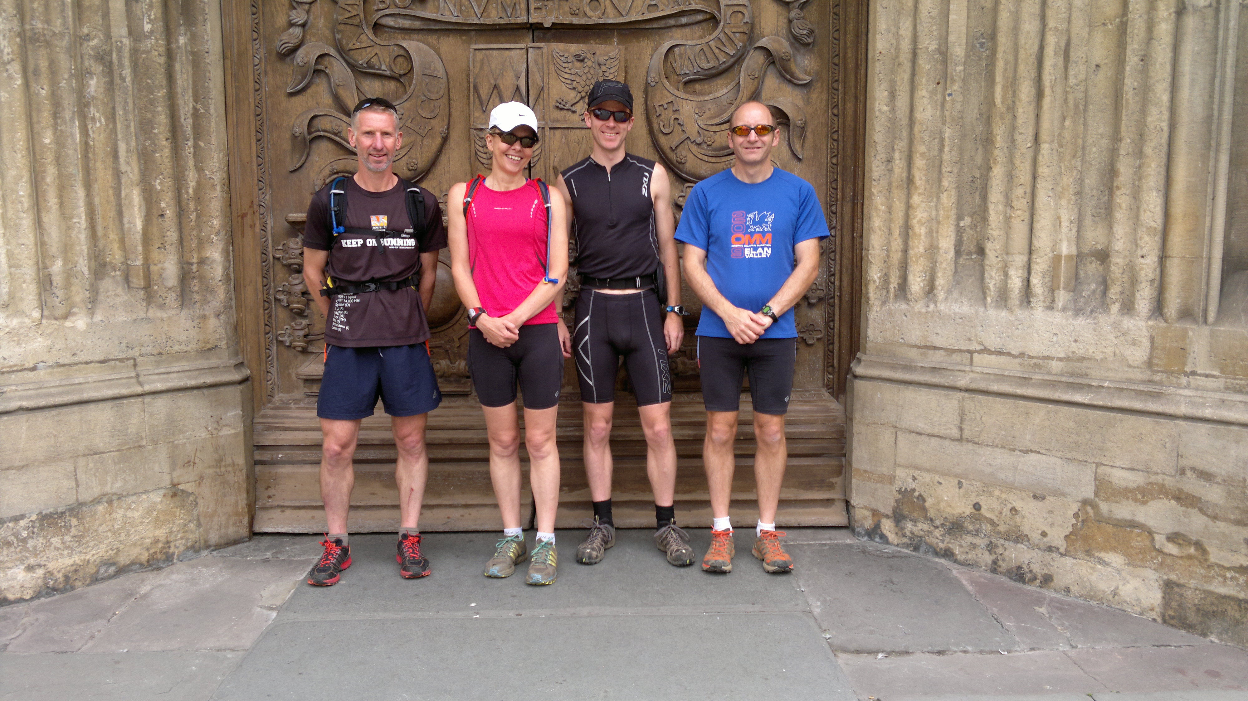 Start at Bath Abbey. From L – Mark (ran to 55miles), Sue, Me, Tom. Pleased the rain had stopped, but it was hot (and busy)