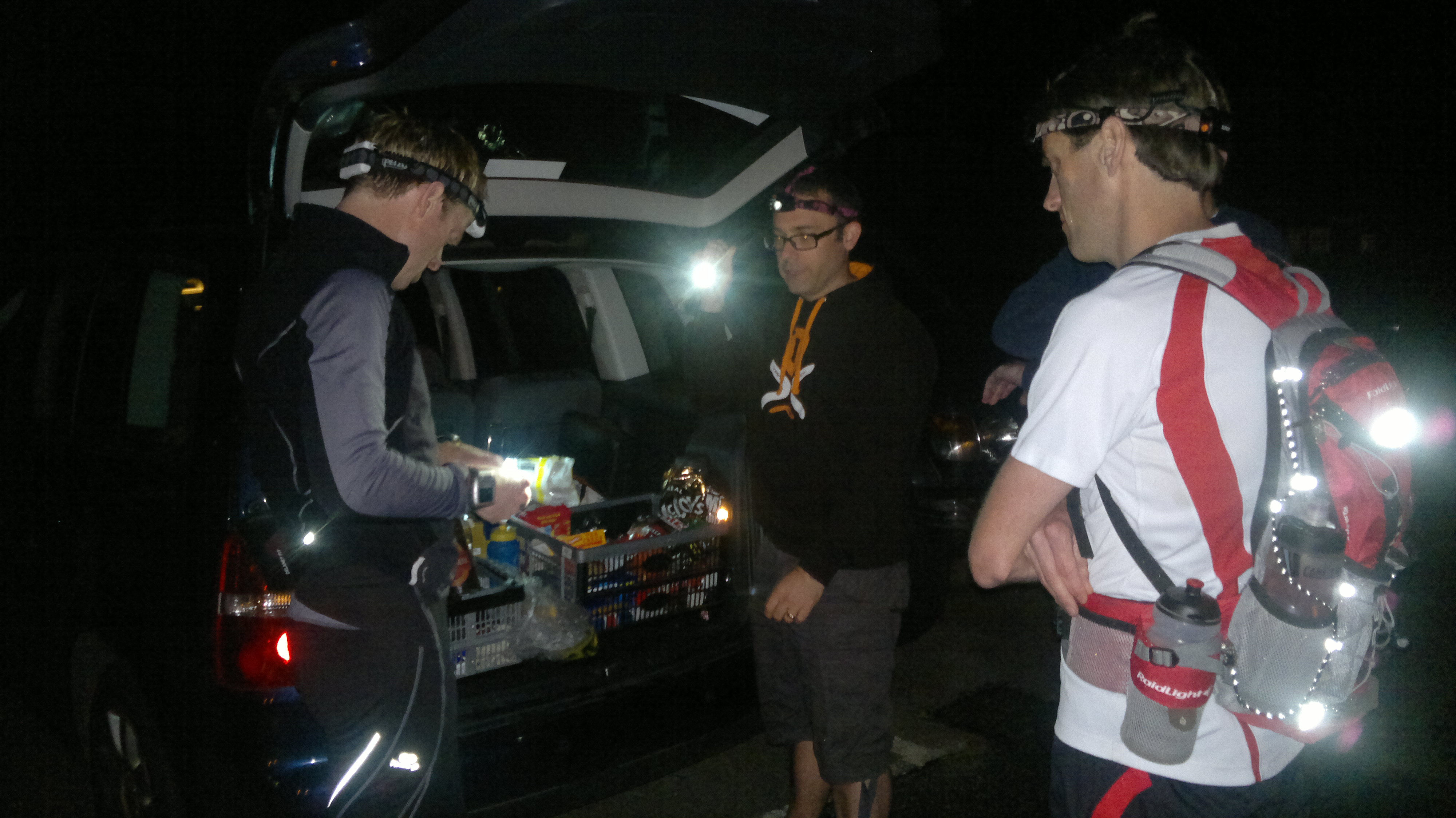 Changeover at Painswick. Scott and Austin on the right. Prepping for some night running over the Cotswold Way.