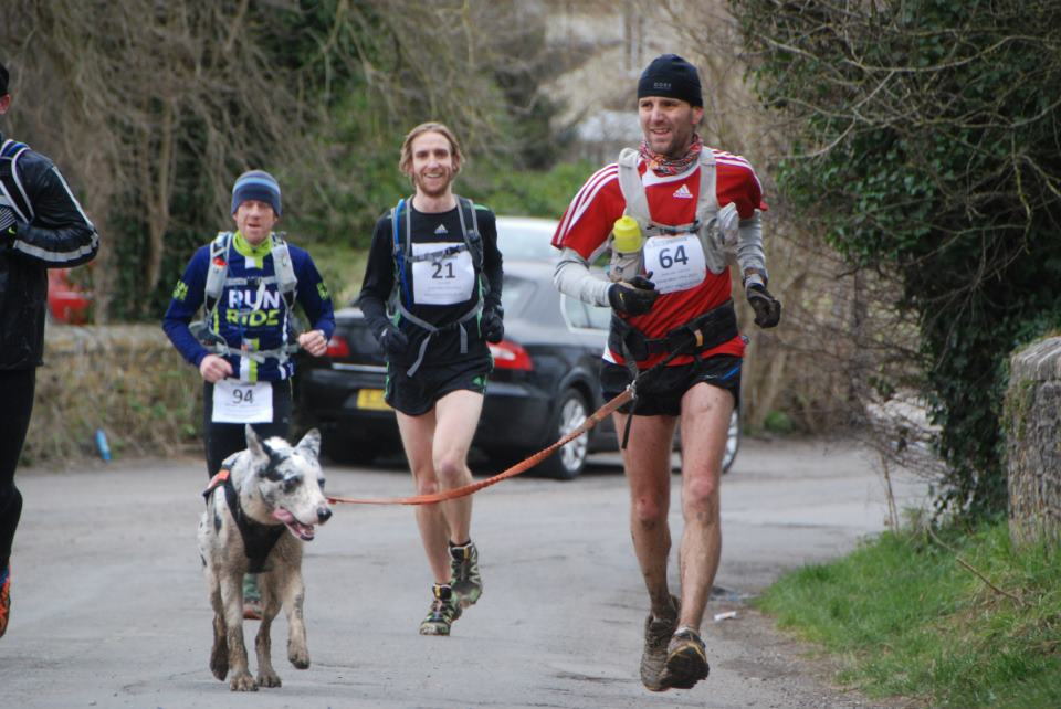 At the gun a couple of Canicross runners took to the front. I had a quick chat with Alex Foster, and Zoltan Lesi who was running with a Blue Merle Border Collie. You could sense the power and enthusiasm of the dog before the race even started, it had mojo.   Zoltan told me they are so powerful they can even speed you up in open shorter events.  I wondered though how he would manage over the many gates and stiles on the course.  They not only finished first (and record) in the Canicross event, but also second overall.  After the race I met the winning Canicross relay team.  Great dogs, I particularly liked the German Short-Haired Pointer.