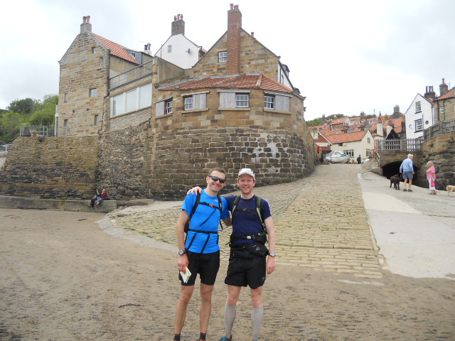 Den did a great job of pacing me for this last section around the coast.  Shouting words of encouragement and staying about 10-20m ahead, it worked really well and we were hitting 10:00/M over uneven terrain.  It felt as hard as any ultra race I have competed in.  Everything was over-used and the body just wanted to take a break.  As we ran down the steep hill of Robin Hood’s Bay Den spotted Warwick in one of the cafes and gave him a shout.   He made it down to the sea front and our finish line in time to take a couple of photos.