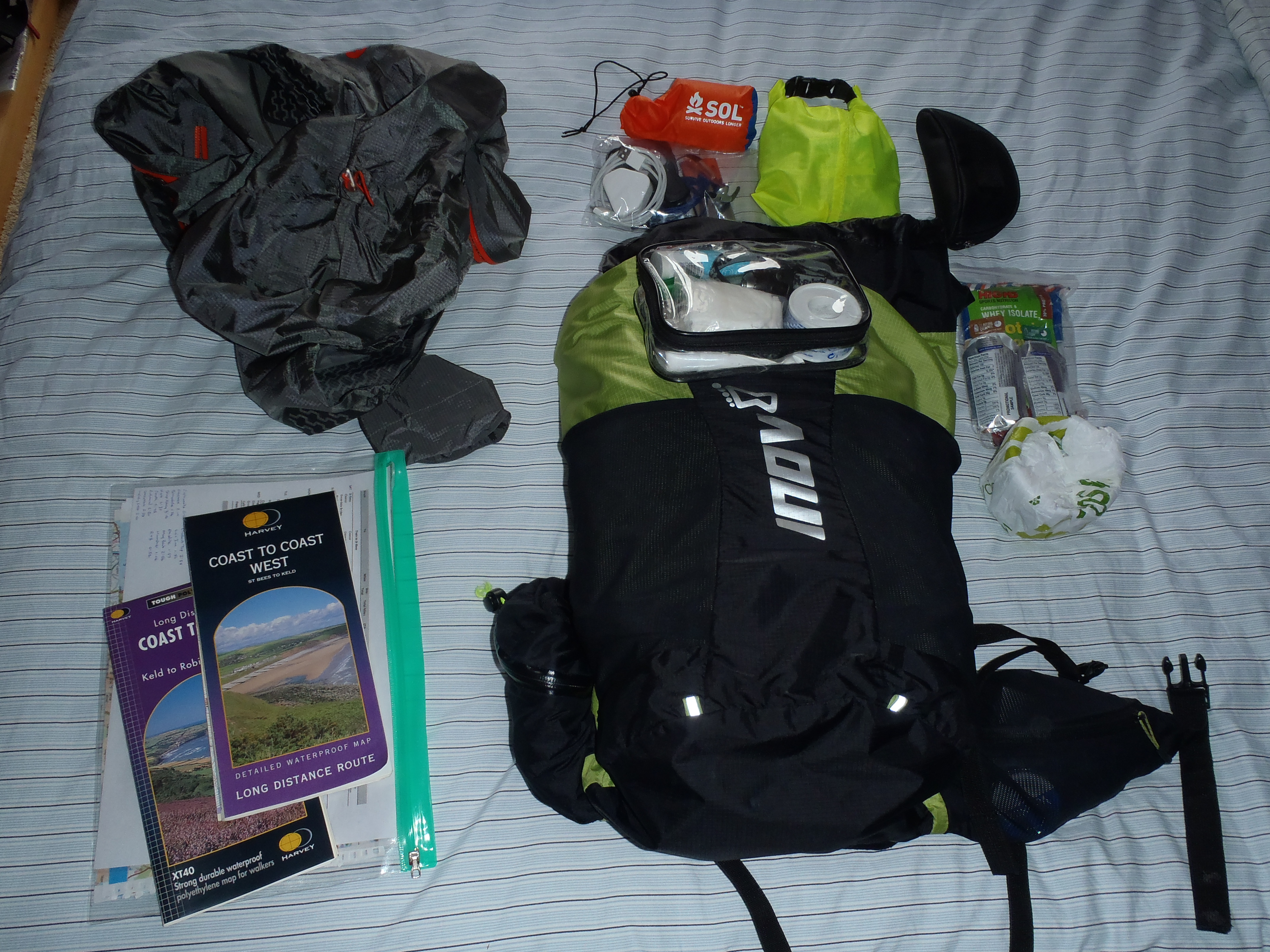 Apart from the accommodation I was completely self-sufficient up to the final day ie I would carry everything I needed with me to get through the 4 day period.  I’d created an excel sheet in advance listing all the light-weight items required (I was quite thorough with this using electronic kitchen scales to compare items) and practised a few miles running with the equivalent weight.  I found that 5kg was about the limit to enable me to hold running form albeit at a slower sustained pace of circa 9:00mins/mile.  My pack weight came out at 4.5kg, but that without food and liquid.  I put together 300g of emergency food (900cal).  So with a full 750ml bottle I was looking at 5.5kg for the overall backpack weight as a minimum.  I knew that on the longer sections of the route where I couldn’t get food or water (apart from streams) that I would more likely be carrying around 7-8kg.