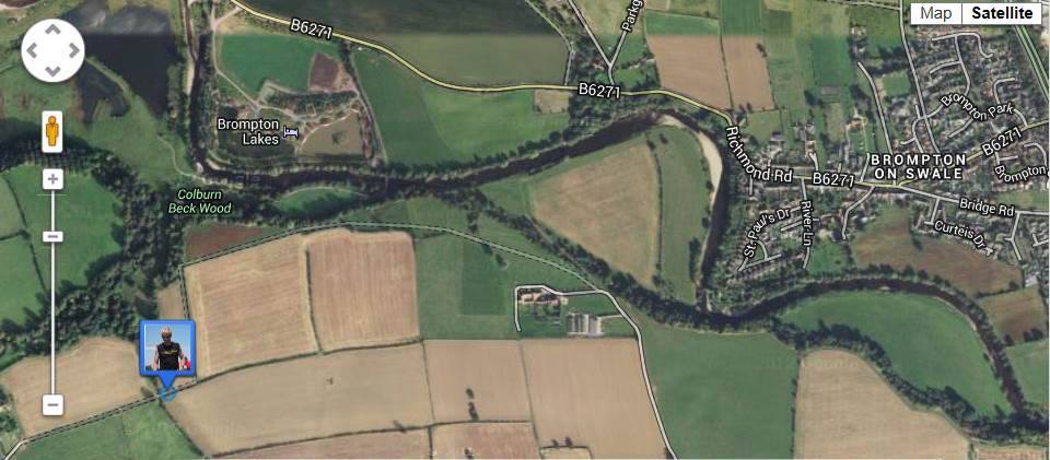 It was now getting dark and the temperature had dropped as I left Richmond.  My brother and girlfriend were both at home following me on GL, exchanging the odd text as they saw my icon move around google maps.  When I reached a field at St Giles I needed to find a footbridge to get to the north side of the Swale, to Brompton and the Camping Barn.  I was sure I was standing in the right field and entertained the idea of phoning Dean or Yve to see if they could guide me via GL (see pic below).  I’m not sure it would have helped but I managed to find my way eventually, climbing over a fence and down a steep wood to the footbridge.