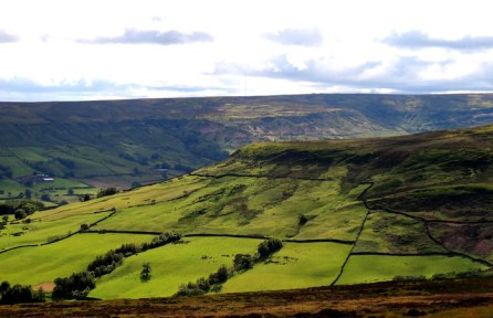 After reaching the Lion Inn I doubled back thinking I could find a more direct path track off the hill.  I couldn’t.  The broken paths marked on the Harveys map were long gone.  I decided to plot my own way through the heather, but came unstuck  at the top of a 30m drop at Potters Nab.  I sat for a while considering my options.  I could head back up a mile through the heather to the Lion Inn and then walk down and up the Farndale valley for 3-4 miles.  Or I could take a slight risk and scramble down the ridge, over a fence and through the following field and woods.   The adventurous side of me took over and I went for the latter.  I was a bit wobbly at first, but after chopping my way through some of the thicket in the woods, while preparing my excuses for Elma Fudd I eventually found a stream that came out of the back of someone’s farmhouse.  Some curious looks were thrown my way so I made a hasty retreat.