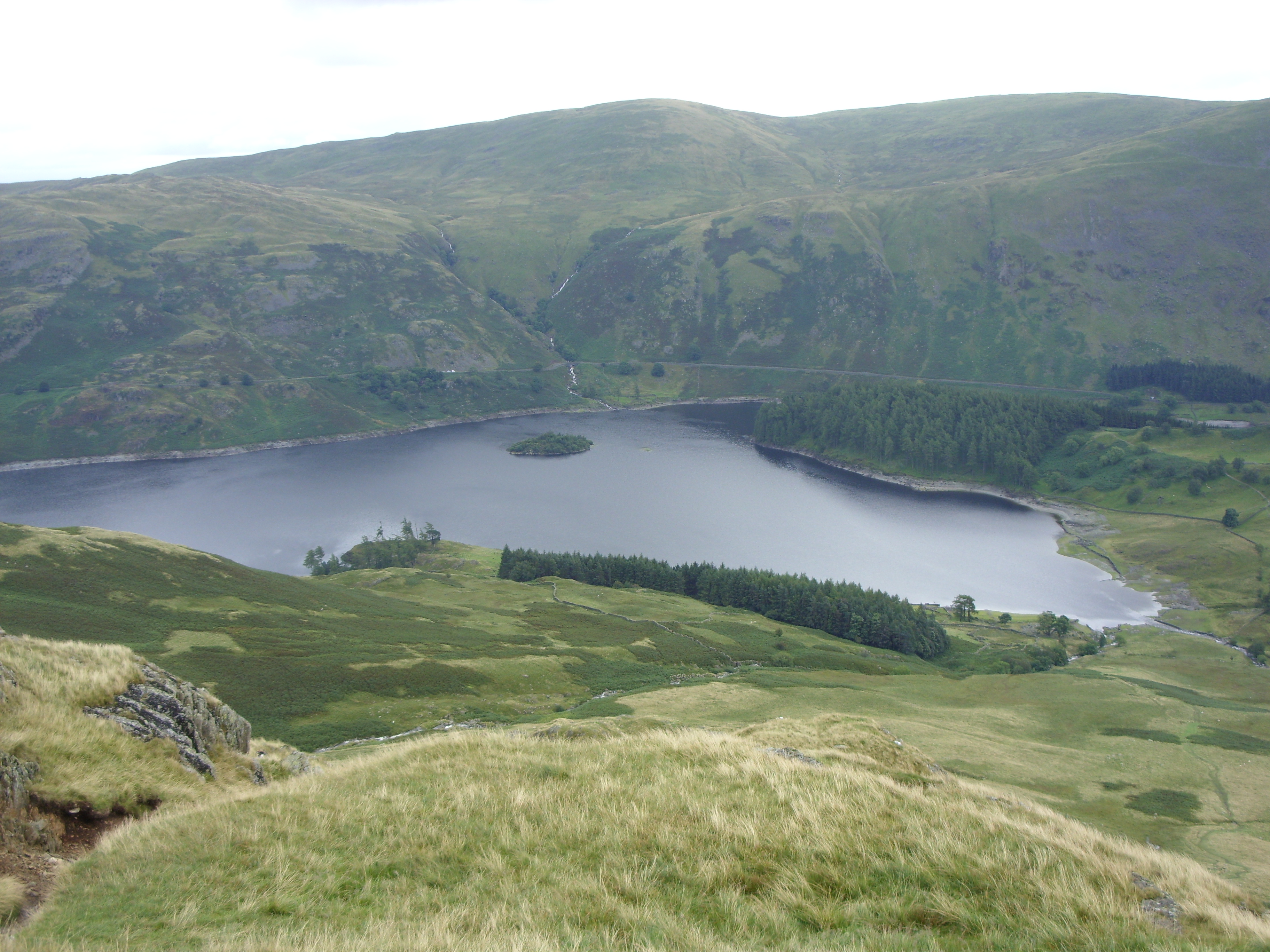 The route turns short of Grasmere, heading past an independent Youth Hostel.  It was 11AM and rather than head into town for a few supplies I decided to top-up my bottle at the Hostel and then carry on up to the main road and then once again hit the track going straight up Tongue Gill towards Grisedale Tarn (550m).  I enjoyed exchanging a few words with the other walkers, but it was quite a grind on the body.  Despite my relief at finally reaching the top and the great view of Grisedale Tarn, I was now starting to consider how tough the section from Patterdale to Haweswater was going to be later in the day.